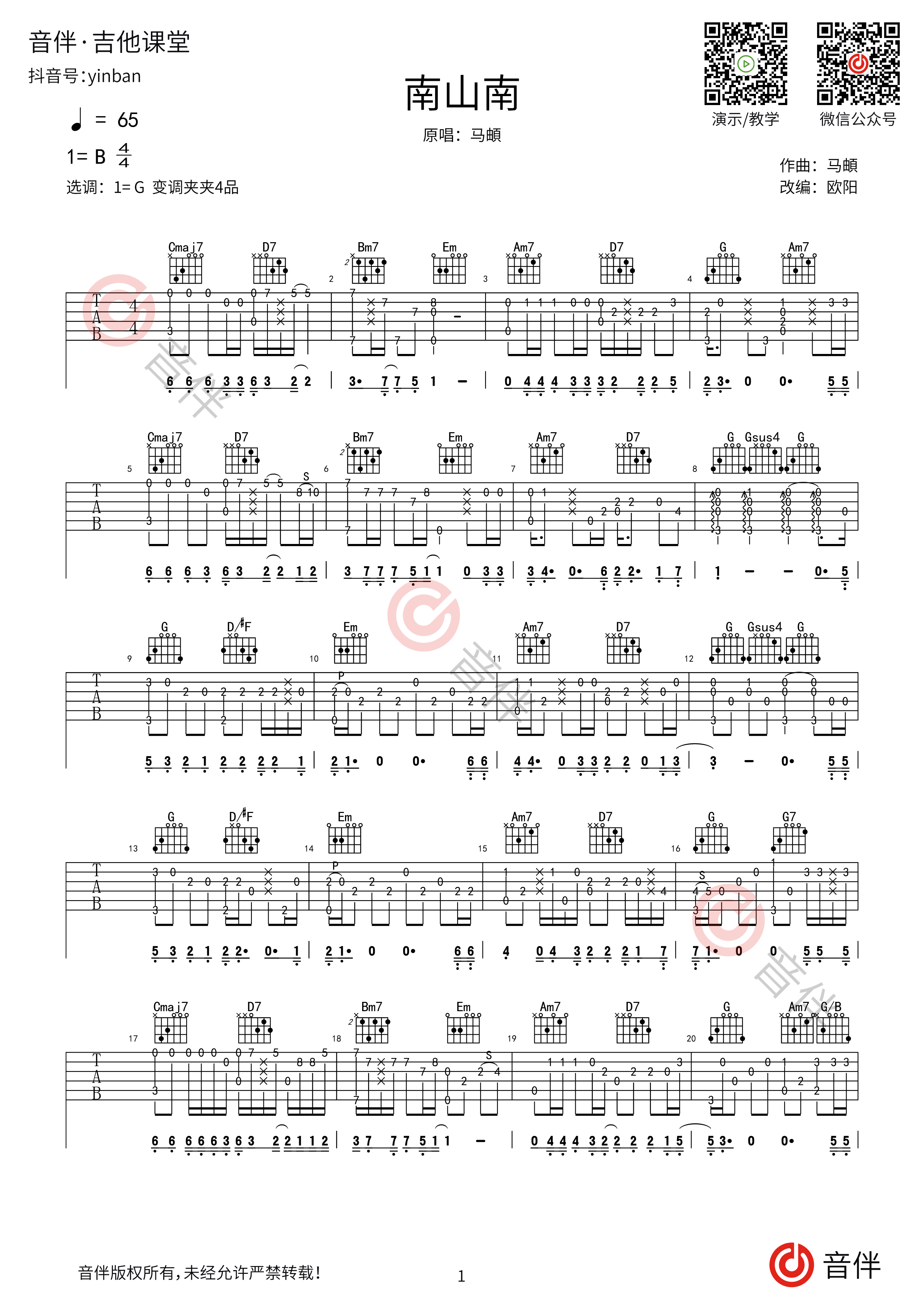 马頔 南山南指弹吉他谱 G调高清指弹谱 long 2020.05.11 指弹谱 阅读 28647 9 专为初中级水平的琴友编配,这首歌曲原曲为B调,同样为了方便大家弹奏谱子我们采用了G调指法改编,由音伴欧阳文改编,视频演示部分录制好了就会及时上传分享给大家学习使用。 南山南G调超原版弹唱谱【视频教学】 赞 (10) long 如何下载 在线提问 9 生成海报 陈鸿宇 理想三旬指弹吉他谱 G调高清指弹谱 上一篇 2020.05.10 孙燕姿 遇见指弹吉他谱 G调高清指弹谱 完美前奏/间奏/尾奏编配 下一篇 2020.05.11 相关推荐 傲寒吉他谱 马頔 G调高清弹唱谱 2020.09.29 南山南吉他谱 马頔 G调超原版编配【视频教学】 2019.08.29 马頔 南山南吉他谱 G调高清弹唱谱 2022.07.17 发表回复 请登录后评论...登录后才能评论 提交 评论列表(9条) 08222 2020.06.19 谱子里用的是切弦还是扫弦? 回复 long 2020.06.19 @08222:没有扫弦,是击弦 回复 8856 2020.11.16 看着排版就看得出来,编配得很完整 回复 67365 2020.11.16 会一直支持音伴的,真的很用心团队了 回复 2222 2020.11.27 值得花时间练习的曲子 回复 2442 2020.12.23 这么经典曲子求教学 回复 0059 2020.12.23 白听不厌 回复 0965 2020.12.23 非常不错 回复 1793 2021.01.26 简单好听 回复