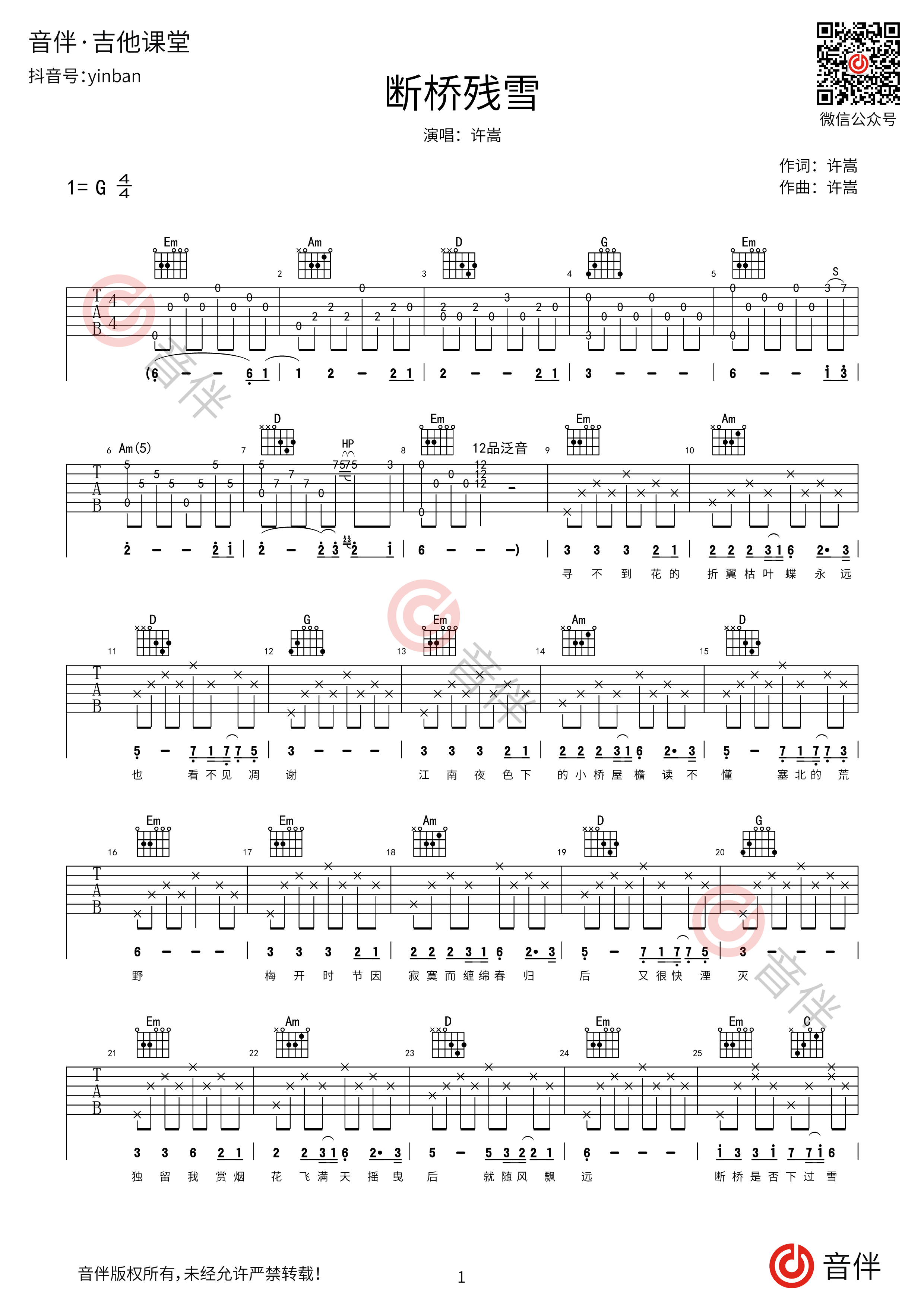断桥残雪吉他谱 许嵩 G调超原版编配 long 2020.05.31 弹唱谱 阅读 11348 11 这是一首许嵩中国风音乐作品,谱子根据原曲原版和声扒带采用G调指法编配,并且我们根据原曲编配了完整的前奏、间奏以及尾奏。 赞 (16) long 如何下载 在线提问 11 生成海报 风继续吹吉他谱 张国荣 C调超原版编配【视频教学】 上一篇 2020.05.31 张宇 趁早吉他谱 G调超原版编配 下一篇 2020.05.31 相关推荐 绝代风华吉他谱 许嵩 C调高清弹唱谱 2020.10.02 乌鸦吉他谱 许嵩 C调高清弹唱谱 2021.06.15 昨夜书吉他谱 许嵩 C调超原版编配【高清弹唱谱】 2021.05.03 玫瑰花的葬礼吉他谱 许嵩 G调超原版编配 2021.03.02 有何不可吉他谱 许嵩 G调指法编配高清弹唱谱【视频教学】 2020.02.03 许嵩 幻听吉他谱 C调超原版编配 2019.12.19 宿敌吉他谱 许嵩 G调超原版编配 2020.10.17 认错吉他谱 许嵩 C调超原版编配【视频教学】 2020.10.22 发表回复 请登录后评论...登录后才能评论 提交 评论列表(11条) 468579 2020.09.14 很不错的一首吉他谱,前奏、间奏以及尾奏都很完整,很值得! 回复 mlxg77 2020.10.21 这应该是90后在初中听得最多的歌了吧 回复 0011 2020.11.09 这种歌居然还编出来了哦 回复 0505 2020.11.18 制作的简单而用心,非常适合初学者 回复 1414 2020.11.23 对新手很友好 回复 1891 2020.11.30 很棒 好听又简单 适合新手弹唱。 回复 小酒馆 2020.12.07 前奏非常的好 回复 87252 2020.12.09 好学,又简单 回复 0159 2020.12.15 非常的接近原版 回复 0183 2020.12.17 还不耐哦 回复 1345 2021.01.04 中啊!! 回复