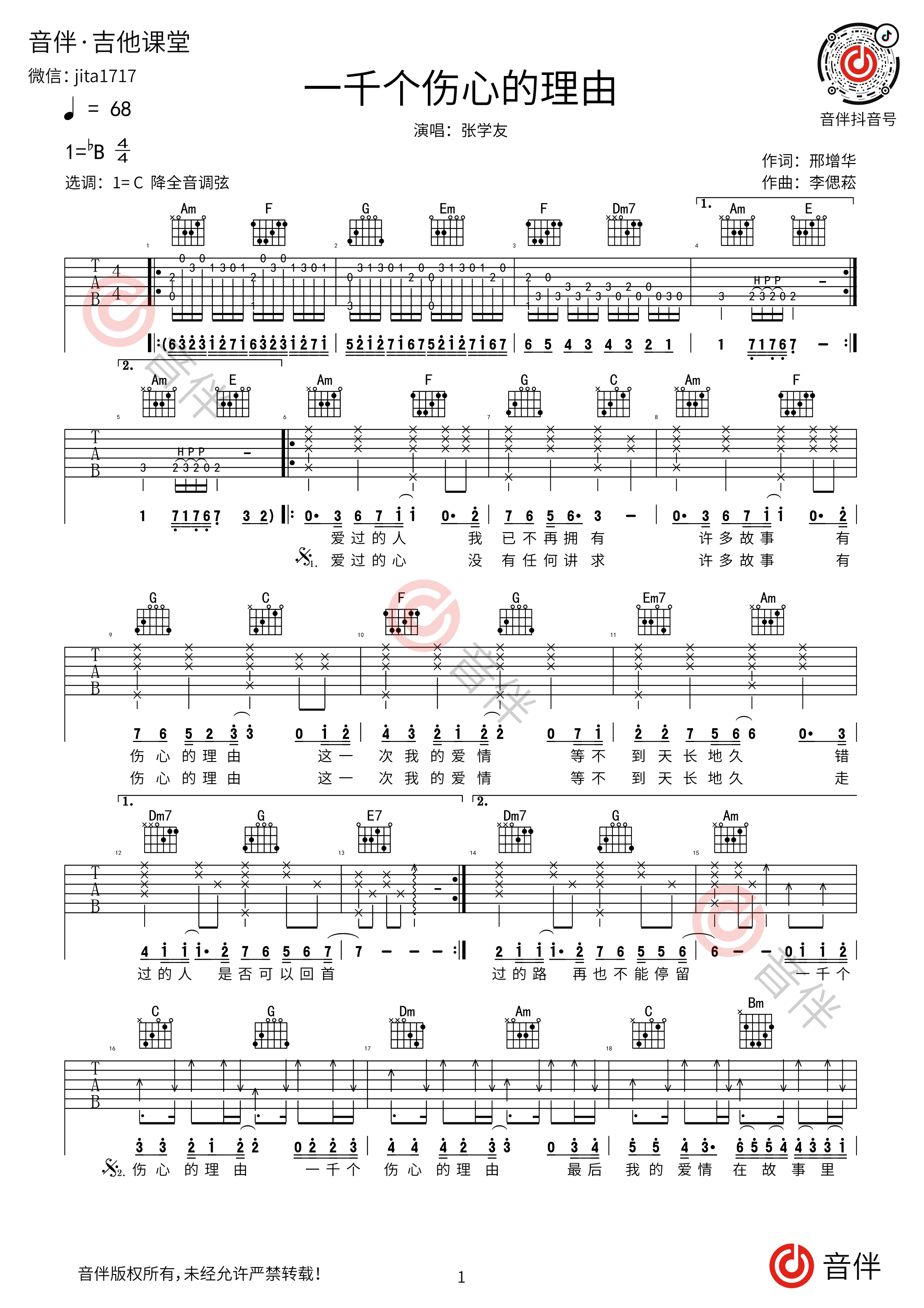 张学友 一千个伤心的理由吉他谱【高清弹唱谱】本曲原调为降B调,谱子编配时我们选用了C调的指法编配,大家在弹奏时降全音调弦就是原曲降B调音高。这首歌曲最为经典的就是歌曲前奏部分,我们根据原曲改编了一个完整前奏,不过稍微有点难度学习的琴友需多加练习才能熟练掌握。一首非常经典的老歌,相信喜欢张学友的琴友们都听过。