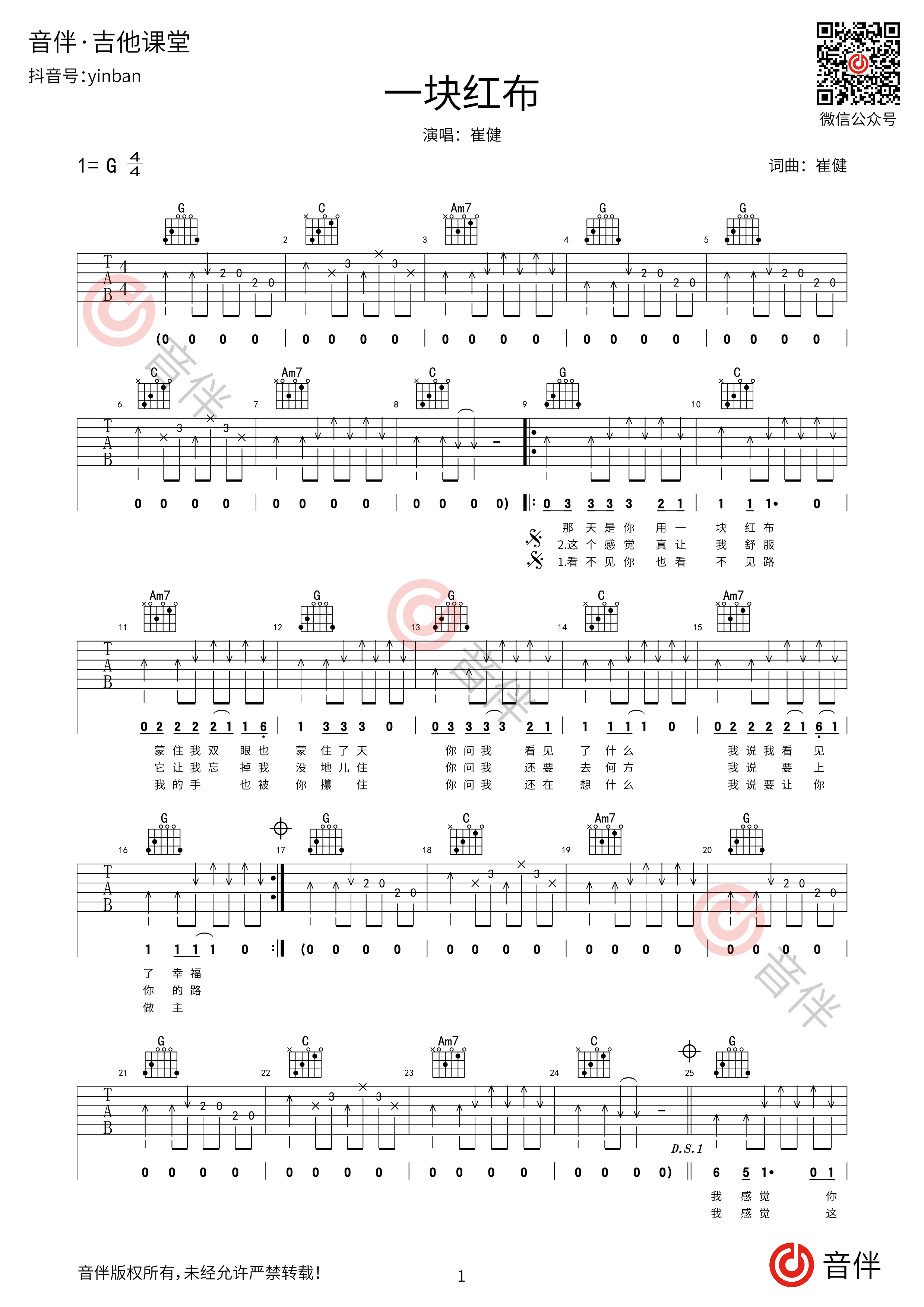 这是崔健老师一首非常经典的摇滚歌曲,原曲为降B调,本谱为G调指法所编配,弹唱时变调夹夹3品为原调音高,大家在实际演唱时如果唱不上可以适当的降低变调夹位置。这首歌曲只用到了三个和弦,整曲都是同一扫弦节奏型,前奏和间奏部分扫弦的同时编配了一些加花效果。