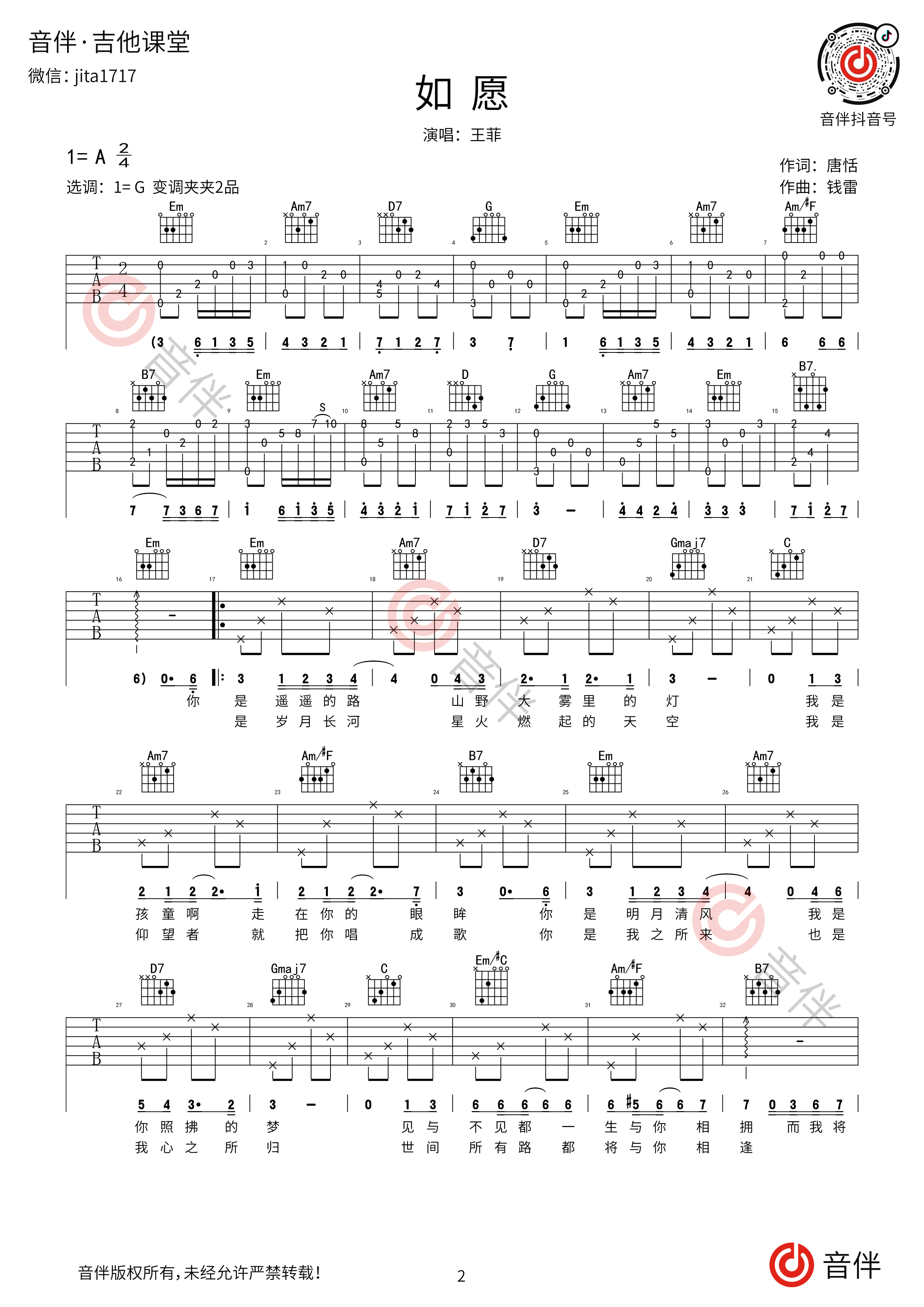 《如愿》这首歌曲原调是A调的音高,我们编配时选用了G调的和弦指法,相对来说指法上要更加的简单。因为是一首女声调的歌曲如果是女声唱可以变调夹夹2品位置唱原调的音高。如果是男声唱的话可能有点高了,可以不夹变调夹如果还唱不上的话可能就要选择其他的调来唱了。这首后续有时间就会给大家安排视频和教学讲解,大家敬请期待!