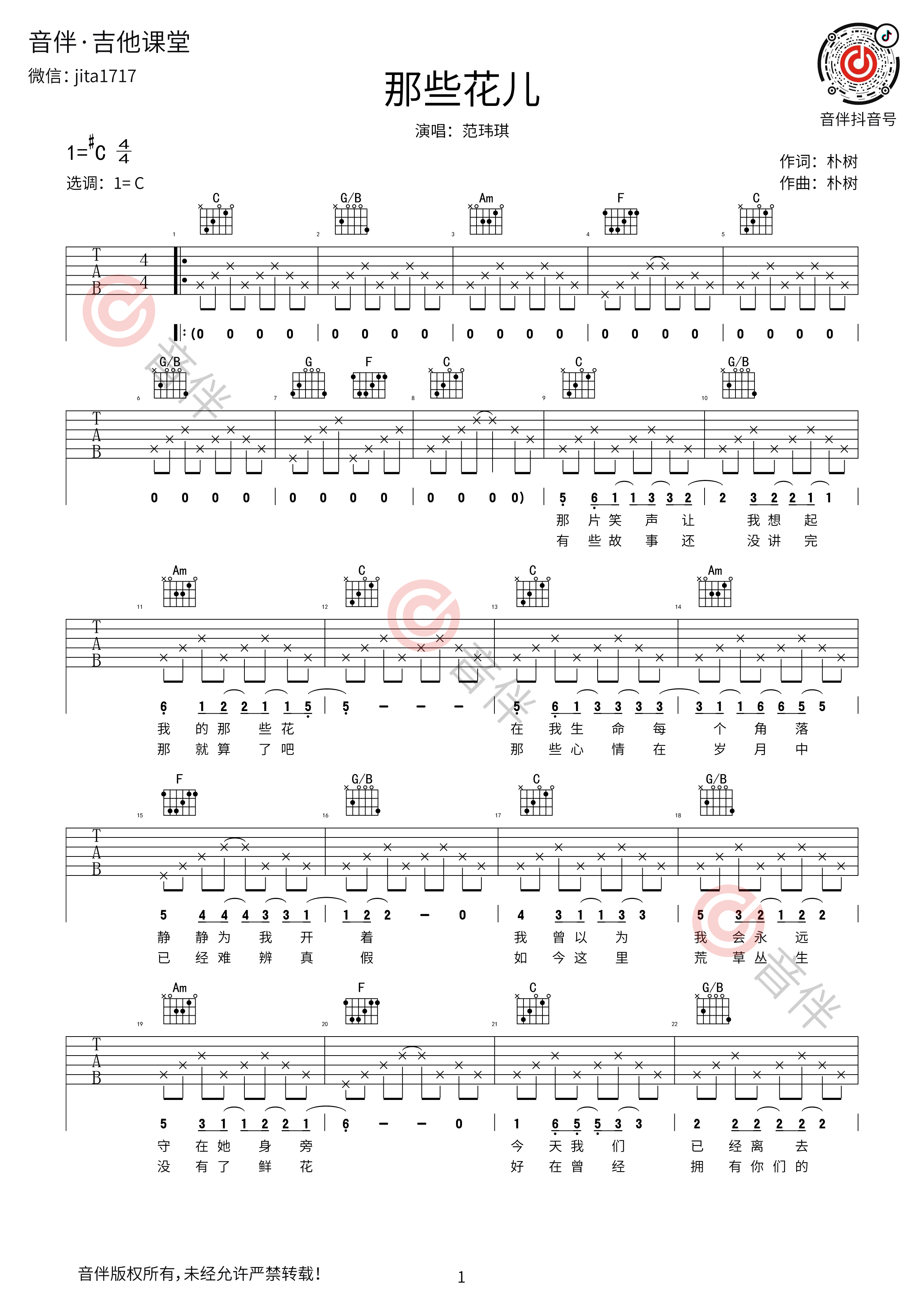 范玮琪 那些花儿吉他谱原版C调指法编配 long 2024.11.12 弹唱谱 阅读 2600 0 范玮琪 那些花儿吉他谱原版C调指法,原曲是#C调的音高,谱子为C调的指法根据原曲原版编配,整体上难度不大,都是分解和弦的节奏型伴奏。这个C调的版本更适合于女声弹唱,如果是男声的话可以学习朴树的那些花儿 赞 (1) long 如何下载 在线提问 0 生成海报 许巍 像风一样自由吉他谱 E调指法原版和声编配 上一篇 2024.11.10 周杰伦 晴天吉他谱原版 G调指法编配 下一篇 2024.11.14 相关推荐 一个像夏天一个像秋天吉他谱 范玮琪 C调简单版高清弹唱谱 2021.03.15 最重要的决定指弹吉他谱 范玮琪 C调高清谱 2020.05.26 悄悄告诉你吉他谱 范玮琪 G调简单版 2019.10.12 那些花儿吉他谱 朴树 G调原版编配【视频教学】 2019.08.30 最重要的决定吉他谱 范玮琪 C调超原版编 2019.10.24 发表回复 请登录后评论...登录后才能评论 提交
