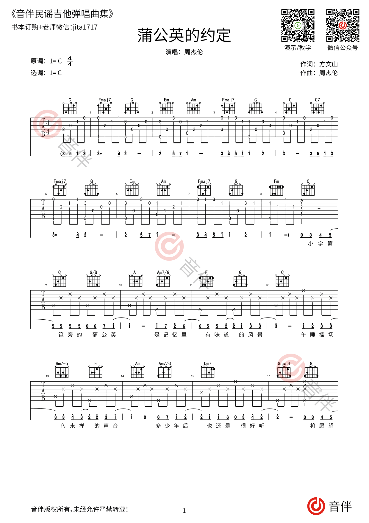 周杰伦 蒲公英的约定吉他谱 C调原版完整版弹唱谱。歌曲采用原曲C调指法编配,弹唱时无需夹变调夹,学习的琴友可以参考我们老师演示视频和教学讲解一起同步学习,不懂的地方欢迎大家进群交流微信:jita1701。小时候的约定虽然很少人会坚持到最后,但是当自己长大后再想想,却发现小时候那段回忆才是最难忘的,都是满满的回忆,那个时候笑容是最天真的,想法是最单纯的