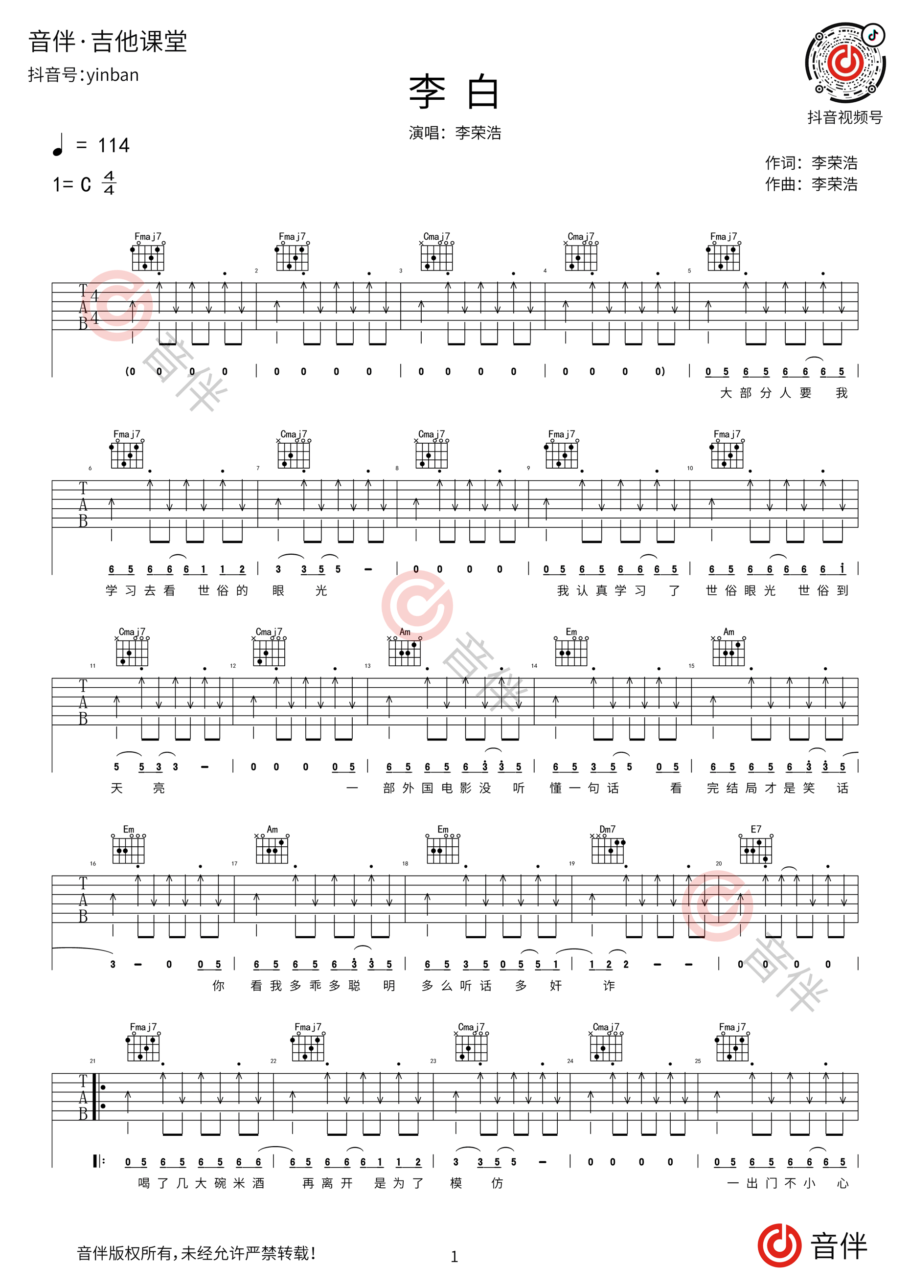 李荣浩 《李白》吉他谱 C调原版编配完整版【附视频演示+教学讲解】 zhou 2024-10-30 李荣浩 《李白》吉他谱 C调原版编配吉他弹唱六线谱完整版,这首歌曲为原调C调的指法编配,整体上和弦的指法没有什么难度,整曲都是采用的同一扫弦+切音的节奏型伴奏,所以只要练习好了扫弦和切音就是能够掌握好这首歌曲。 查看曲谱