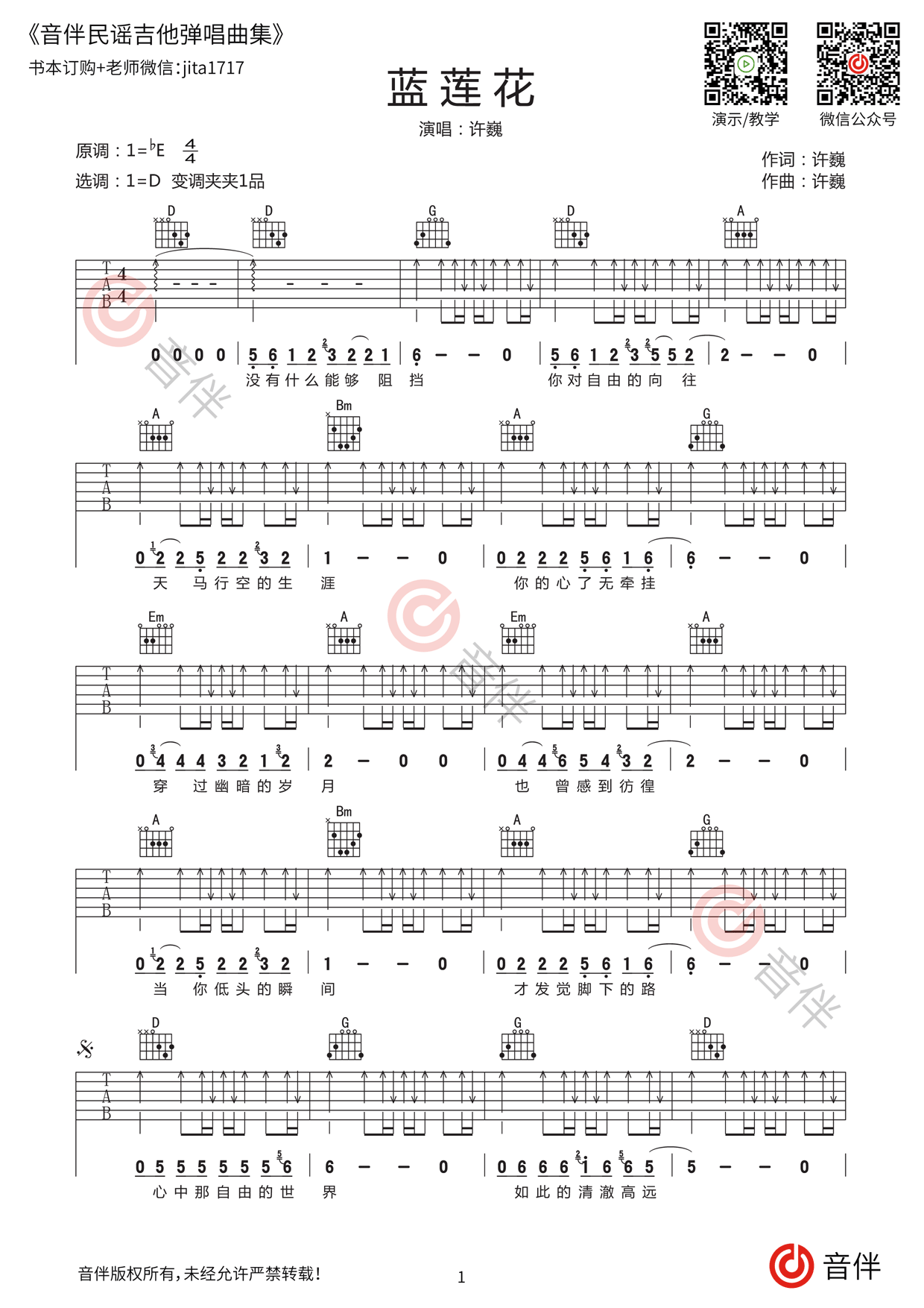 蓝莲花吉他谱 许巍 D调原版弹唱谱【视频教学讲解】 admin 2021-10-19 许巍 蓝莲花吉他谱 D调原版编配高清弹唱谱视频教学讲解。歌曲原调为降E调,曲谱采用D调指法编配,变调夹夹第一品为原调音高。许巍的歌大家都不陌生,许巍的《蓝莲花》真的很惊艳,全曲没有很激扬的曲调,却撼动了无数人的心,虽平静但很有power给人力量,也希望当你听到这首歌的时候,就算遇到困顿也不要丢失希望和远方。 查看曲谱