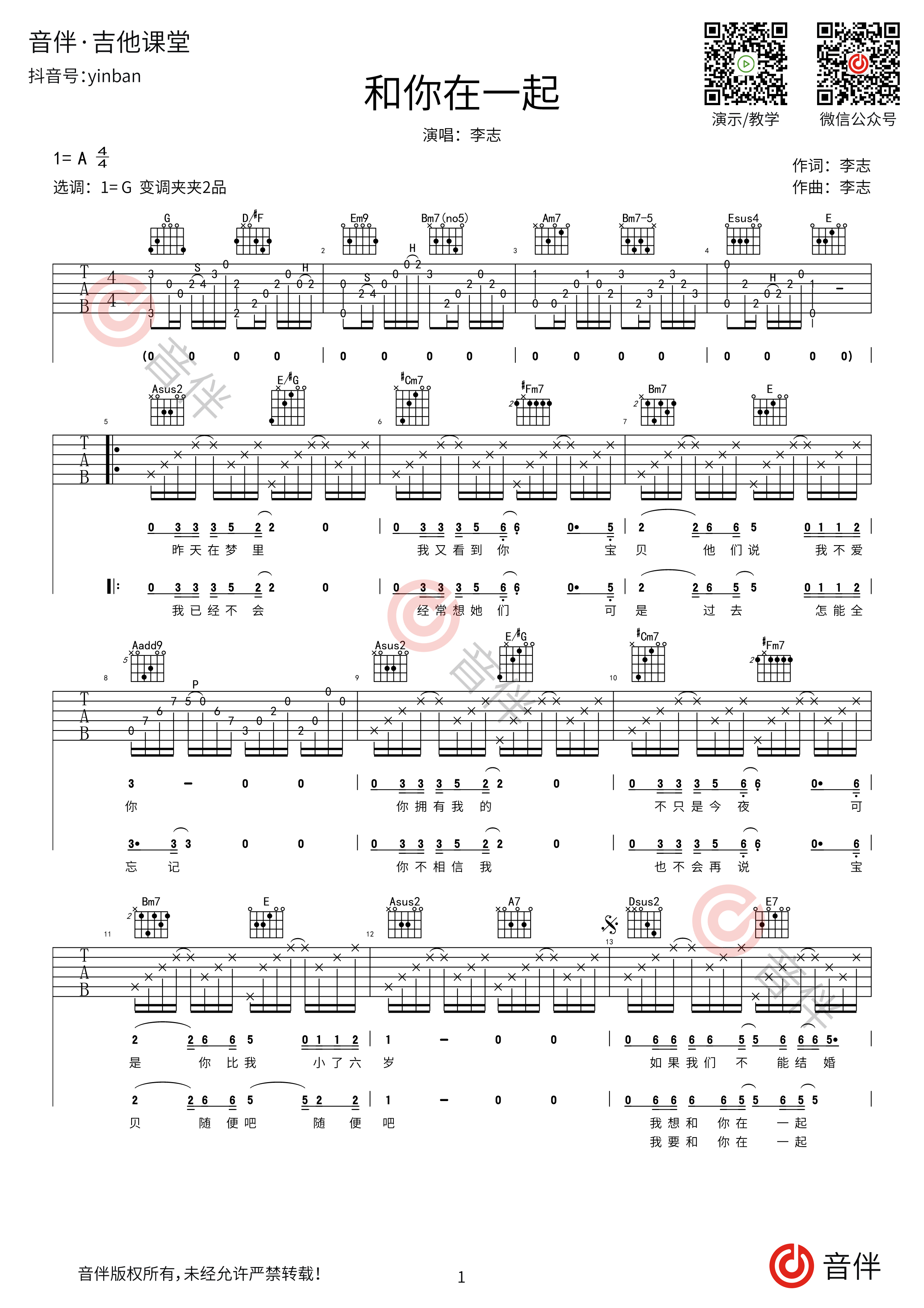 和你在一起吉他谱 李志 G调指法原版编配【高清弹唱谱】 zhou 2021-10-28 和你在一起吉他谱 李志 G调原版编配高清弹唱谱。原调为A调,曲谱采用G调指法编配,变调夹夹第二品为原调音高。李志的《和你在一起》以独白的形式展现歌曲,磁性的嗓音与哀伤的伴奏融合,透出几分无奈与凄苦,用情至深,字字肺腑,一曲终了,便让大家都沉浸在那种无力又哀伤的氛围中,仿佛一起经历了这样的人世沧桑。 查看曲谱